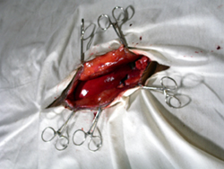 Hevostorso LUPAUS-Elokuvaan, torsossa leikkaushaava mitä eläinlääkäri (Ville Virtanen) puhdistaa. Valmistamme pienempiä sekä isompia kasvojen ja vartaloiden irtopaloja foamlatexista, gelatiinista,